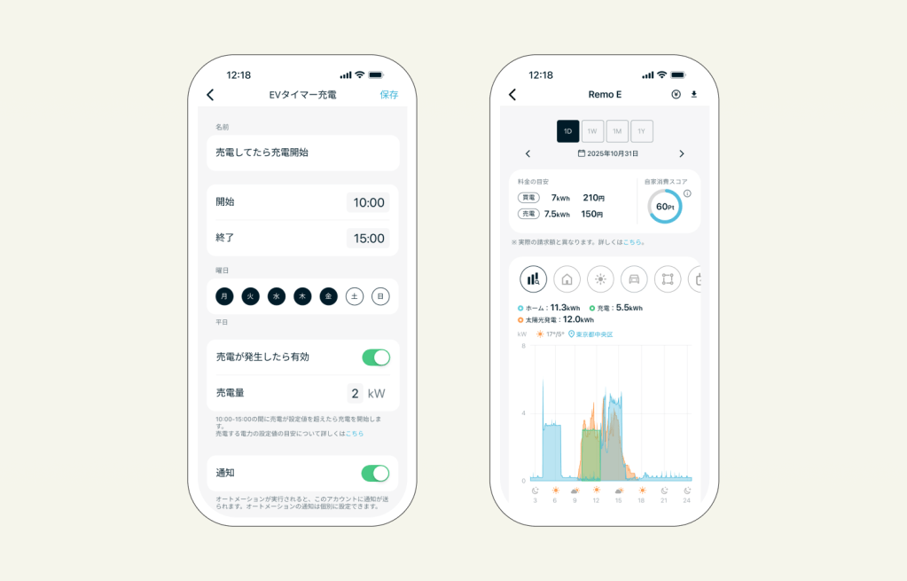 「Nature Home」アプリからEV充電の開始・終了時刻や曜日を詳細に決められる「EVタイマー充電」を設定できます。平日/休日などの生活リズムや、夜間の電力利用が割安な電気料金プランに合わせた充電制御を自動で行い、家庭の電力利用を効率化します。